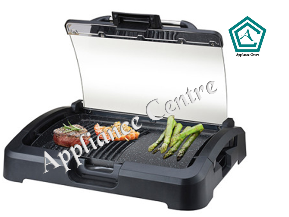 Sear steaks or fry bacon and eggs on this versatile indoor electric grill and griddle. The ample cooking surface provides plenty of space to prepare large meals for your hungry crowd, and the grease channels help drain excess oils and fats away. Close the classy glass lid to help keep your kitchen splatter-free.